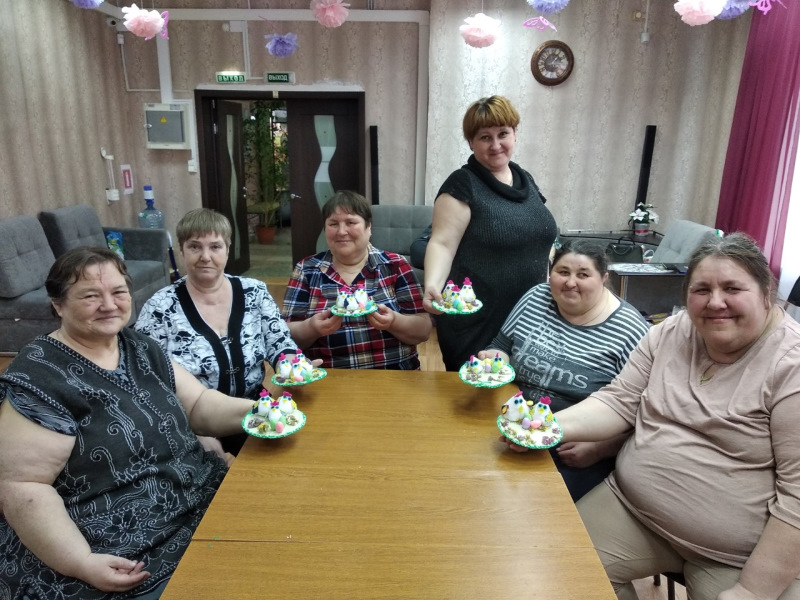 Сегодня отдыхающие отделения дневного пребывания изготовили пасхальную композицию из подручных материалов.